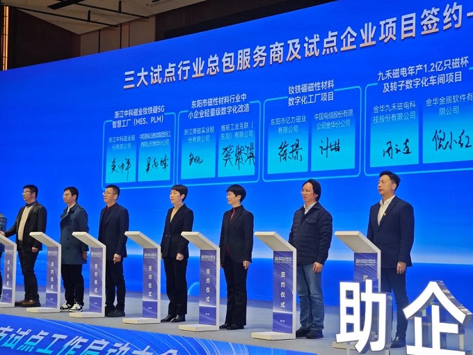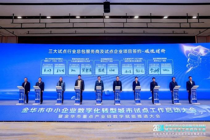 金華金辰作為此次金華市中小企業(yè)數字化轉型城市試點總包服務商(電動工具、磁性材料),倪小紅女士代表參與了此次啟動儀式。在啟動會上與磁性材料試點企業(yè)——九禾磁電進行項目簽約,率先開展數字化轉型實踐。標示著金華金辰在金華政府的支持下,將逐步探索出一條符合本地中小企業(yè)實際情況的數字化轉型特色之路,為中小企業(yè)數字化轉型提供有效金華經驗!