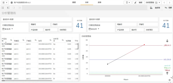 客戶化驗(yàn)數(shù)據(jù)單的結(jié)果,通過BI的方式展現(xiàn)。數(shù)據(jù)的維度是批號,度量是化驗(yàn)項目的檢驗(yàn)值。查詢條件分成兩塊:一是根據(jù)日期范圍、母編號、子編號、產(chǎn)品名稱、批次號、分析項目來檢索數(shù)據(jù);二是根據(jù)日期范圍、母編號、子編號、產(chǎn)品名稱、批次號、分析項目來計算基準(zhǔn)值(比如UCL、LCL、CL+2σ、CL-2σ等)。整體數(shù)據(jù)展示,增加顯示滿足篩選條件統(tǒng)計的批次總數(shù);圖表數(shù)據(jù)表格展示(左側(cè)表格);通過UCL、LCL、上限、下限、CL+2σ、CL-2σ、平均、cp、cpk這些基準(zhǔn)值指標(biāo)來分析檢測值展示檢驗(yàn)結(jié)果的圖表(右側(cè)折線圖);增加分析項目檢測值單位顯示(折線圖左側(cè))。