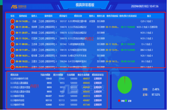 建立模具保養(yǎng)方案,保養(yǎng)計劃,根據(jù)現(xiàn)場生產(chǎn)實際情況記錄上模下模記錄,車間可以實時查看模具相關(guān)報表。