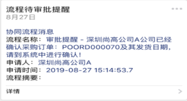 啟用采購(gòu)協(xié)同管理的供應(yīng)商通過(guò)微信接收到同步的采購(gòu)訂單信息后,對(duì)所屬的采購(gòu)訂單確認(rèn)后進(jìn)行發(fā)貨。全程高效協(xié)同,實(shí)現(xiàn)有計(jì)劃的集中采購(gòu)(微信端接收信息與處理)。